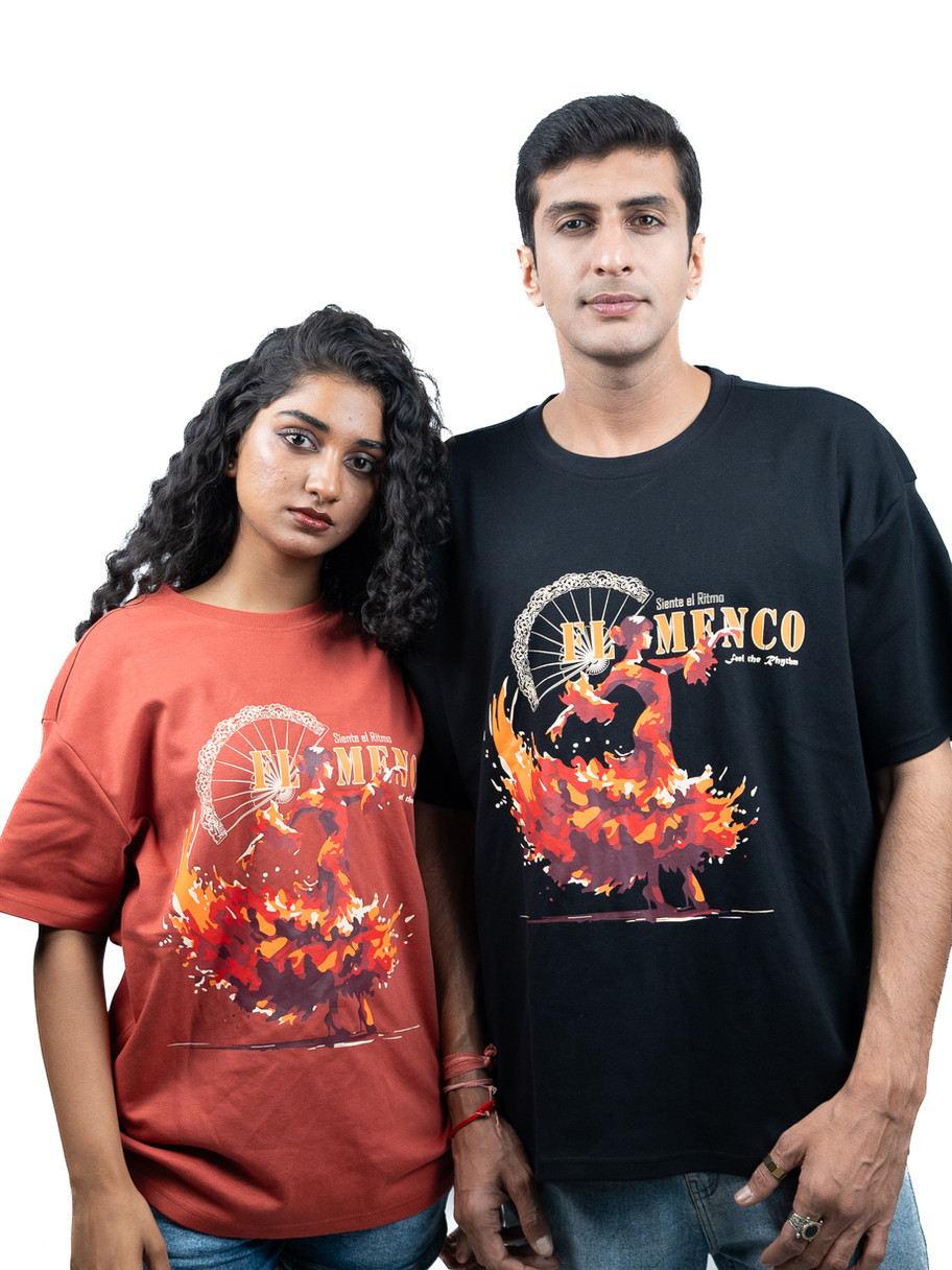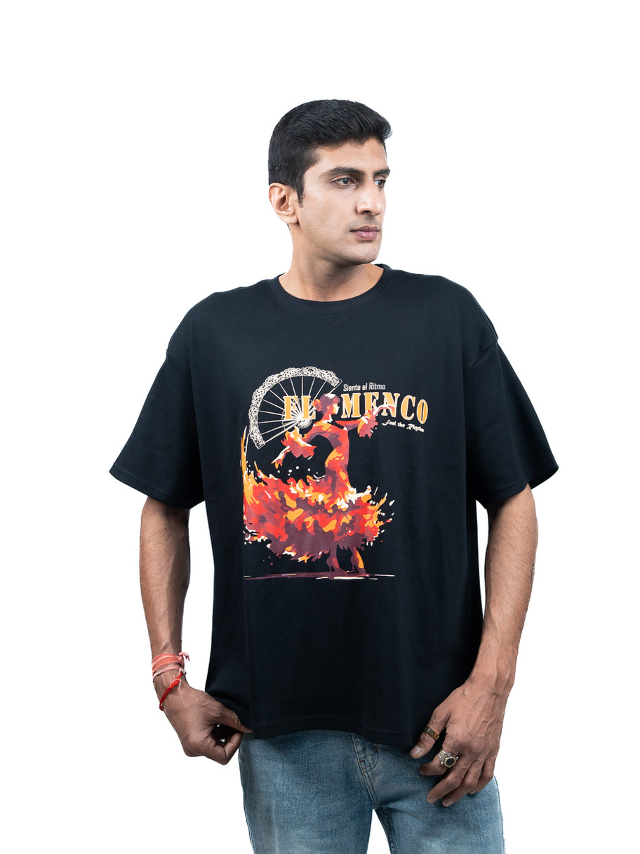Bold black T-shirt featuring fiery flamenco dancer graphic with automatic screen-printing for higher longevity.